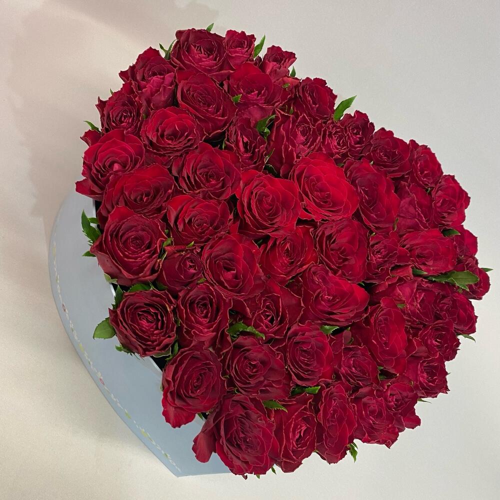 Роза красная – 51 шт.Коробка-сердце – 1 шт.Оазис флористический – 2 шт.