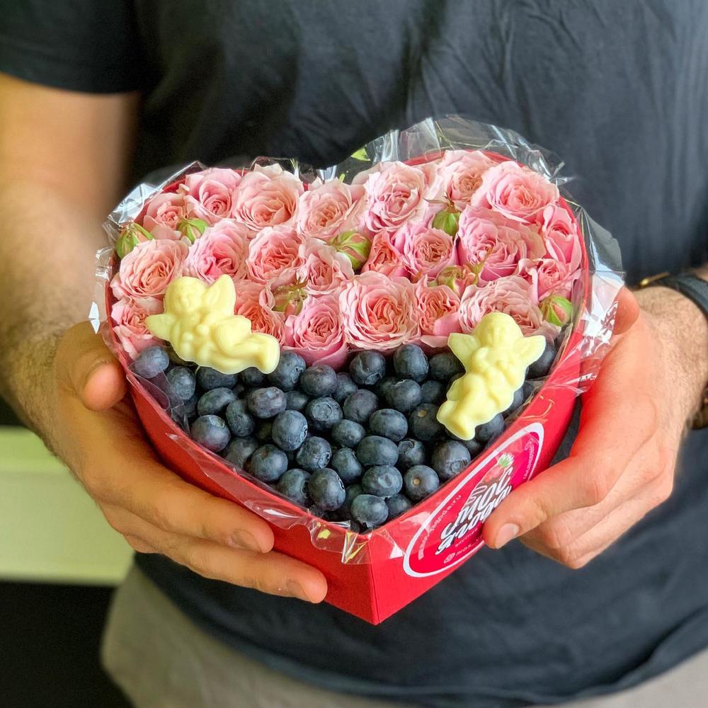 “Сладкое сердце ” – цветочная композиция с сладостями в коробке “Сердце”