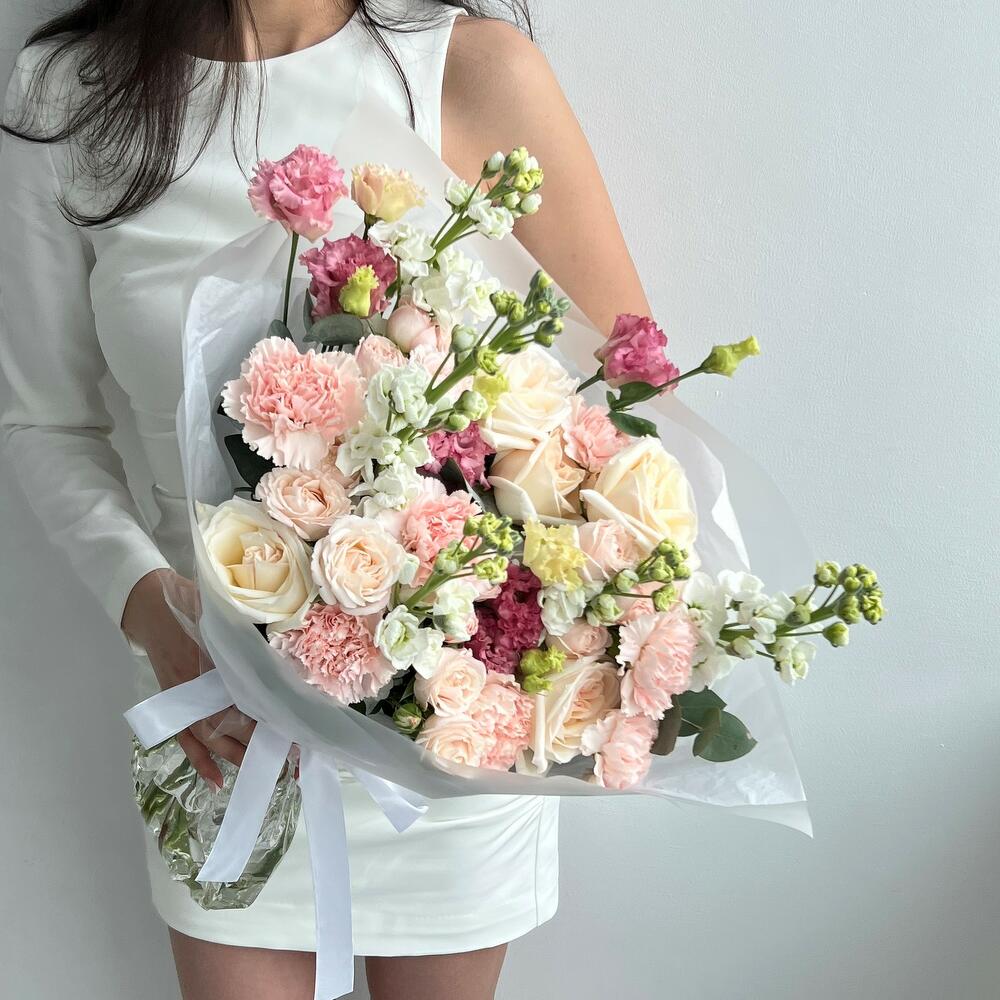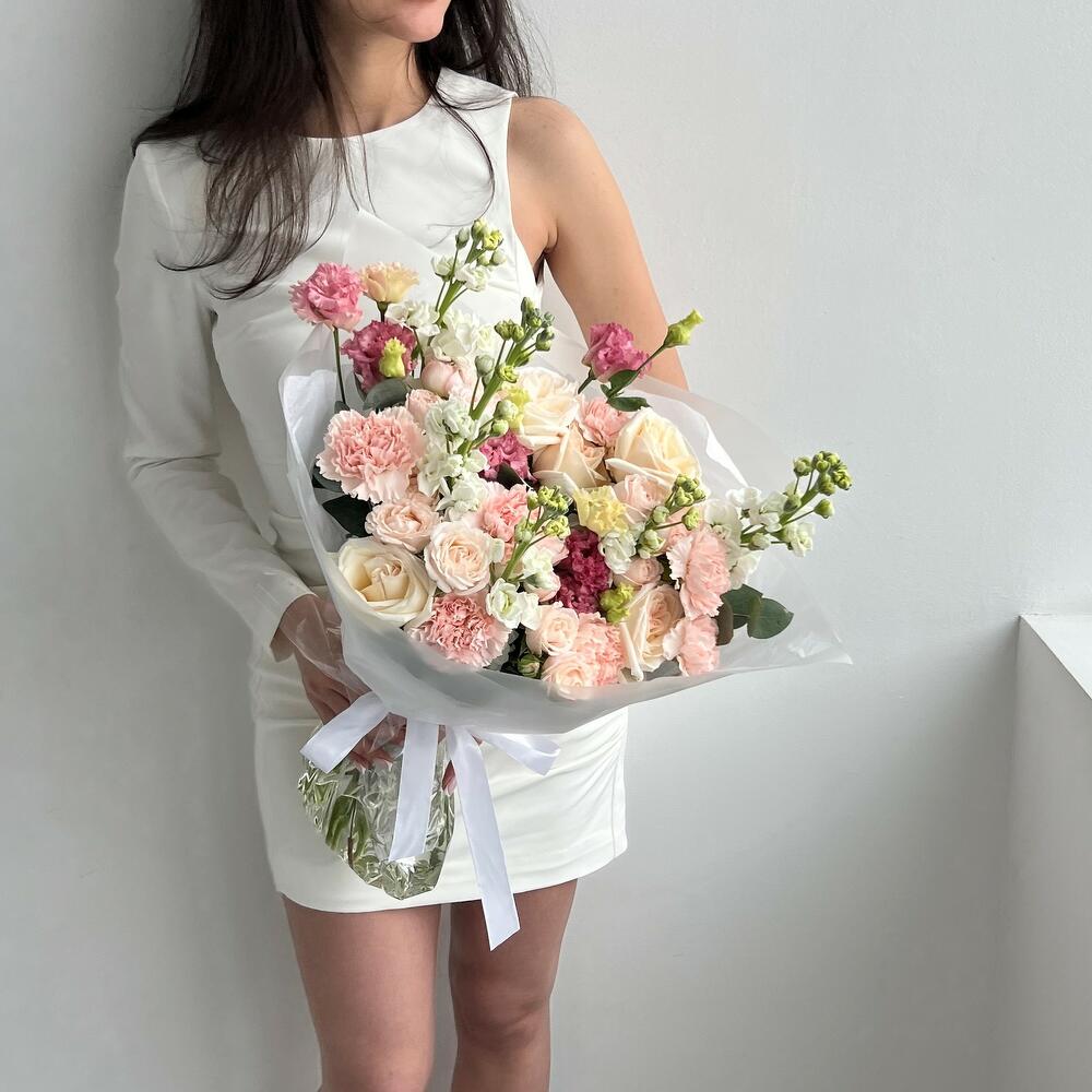 Маттиола – 5 шт.Эвкалипт – 3 шт.Кустовая роза – 4 шт.Гвоздика – 7 шт.Эустома – 3 шт.Садовая роза – 5 шт.