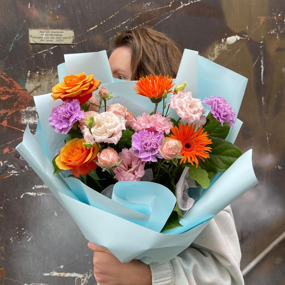 гербера мохровая – 2 шт.Диантус – 3 шт.Салал – 2 шт.Роза оранжевая – 2 шт.Роза пионовидная кустовая – 1 шт.Лизиантус – 1 шт.Упаковка дизайнерская – 3 шт.