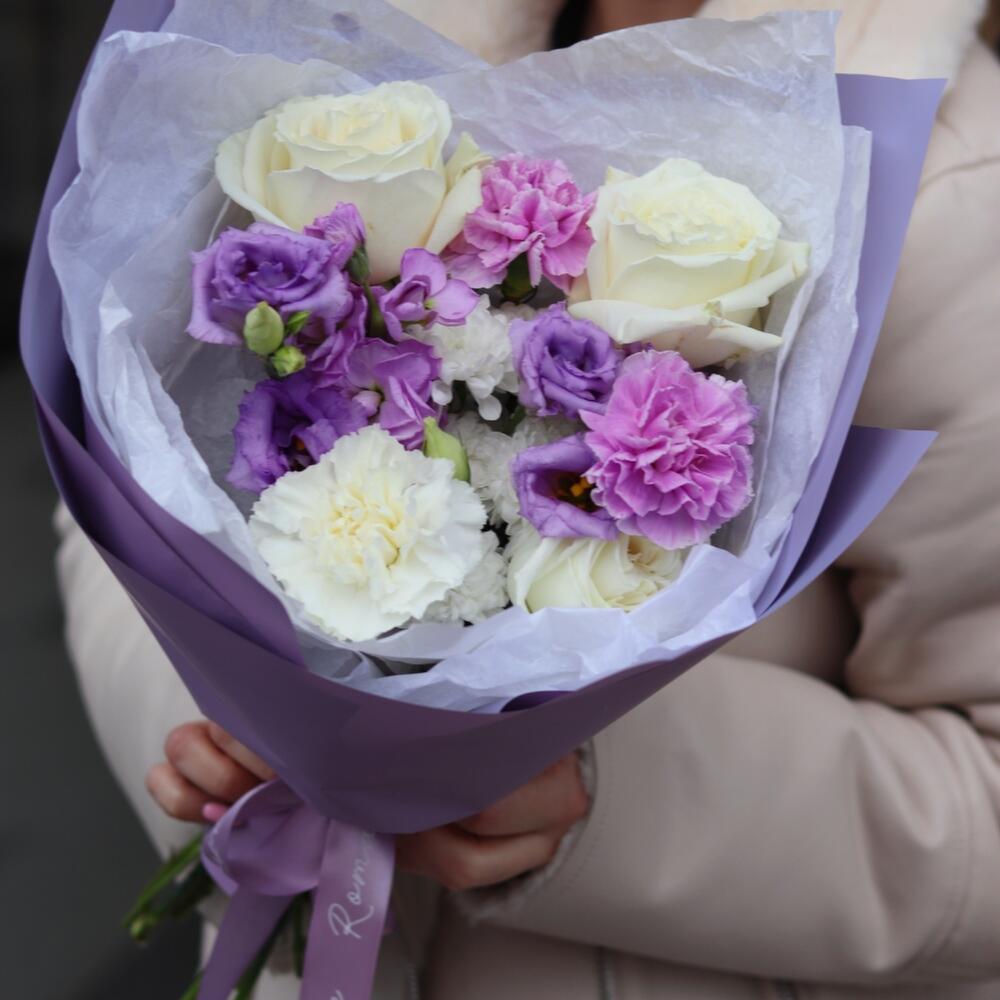 Лизиантус – 1 шт.Маттиола – 1 шт.Гвоздика – 3 шт.Сантини – 1 шт.Роза белая пионовидная – 3 шт.Открыточка с вашими пожеланиями – 1 шт.Шоколадка – 1 шт.