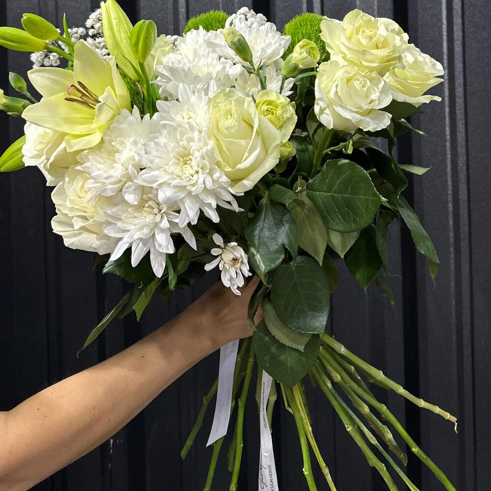 Белый авторский букет словно изящный танец света и чистоты. Изысканно переплетаясь, белые розы, каллы и лилии создают образ нежной элегантности, наполняя воздух сладким ароматом и сиянием свежести. Этот букет словно поэзия из белоснежных красок, в которой каждый цветок является чистым выражением вечной красоты.