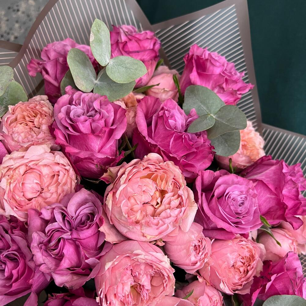роза пионовидная кантри блю – 13 шт.роза пионовидная кустовая джульетта – 5 шт.Эвкалипт – 3 шт.Пленка матовая – 3 шт.Лента атласная – 2 шт.