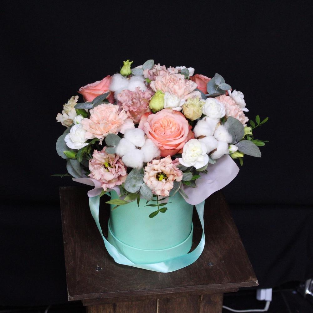 Эвкалипт – 3 шт.Эустома – 2 шт.Диантус – 4 шт.Коробка шляпная – 1 шт.Фисташка – 1 шт.эустома розита вайт – 1 шт.Пленка матовая – 1 шт.Оазис флористический – 1 шт.Хлопок натуральный – 3 шт.Роза пионовидная кахала – 3 шт.