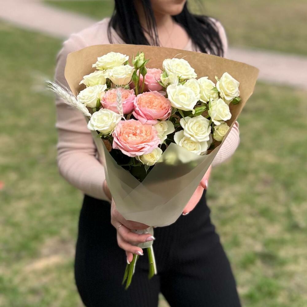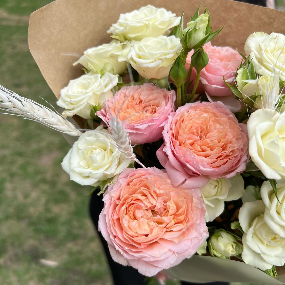 Роза кустовая пионовидная джульетта – 1 шт.роза кустовая сноулейк – 3 шт.Колосья пшеницы – 1 шт.