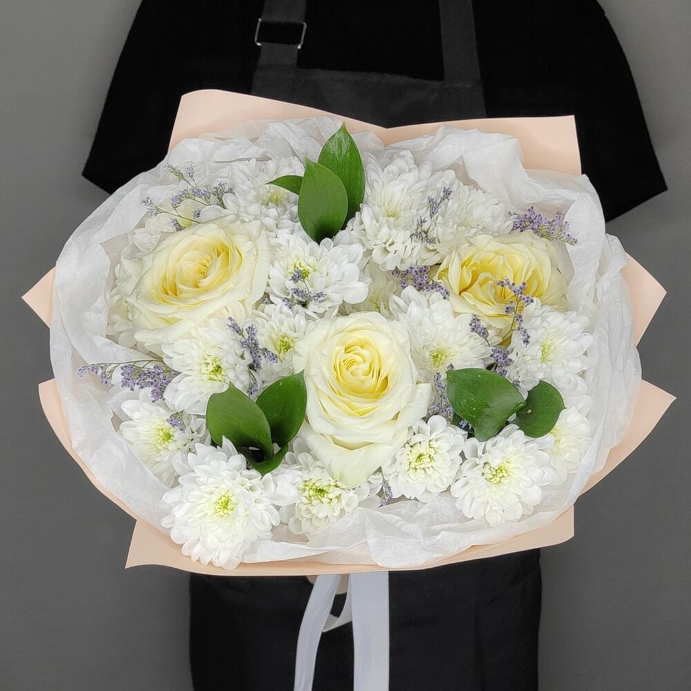 Букет ароматных роз, хризантемы и лилового лимониума "Нежность"