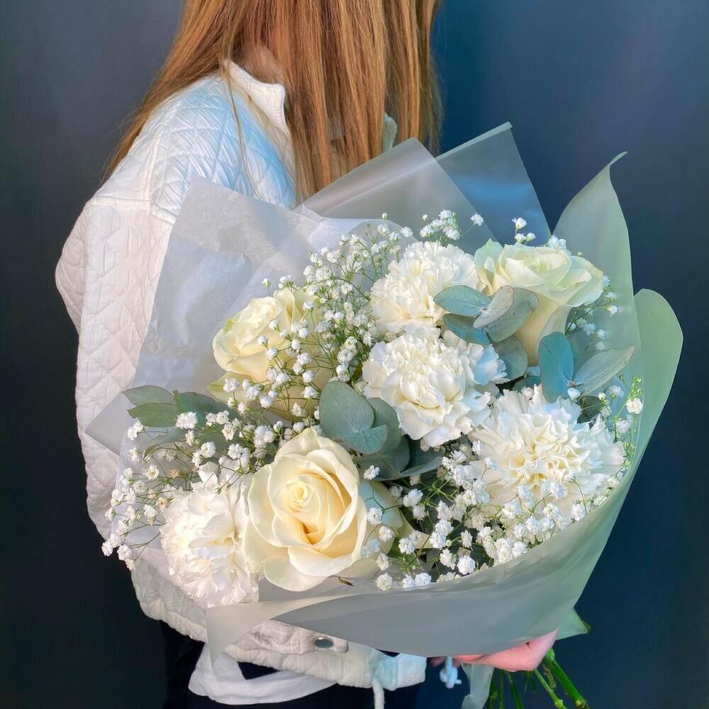Букет белых роз, диантуса и гипсофилы «Portobellos»