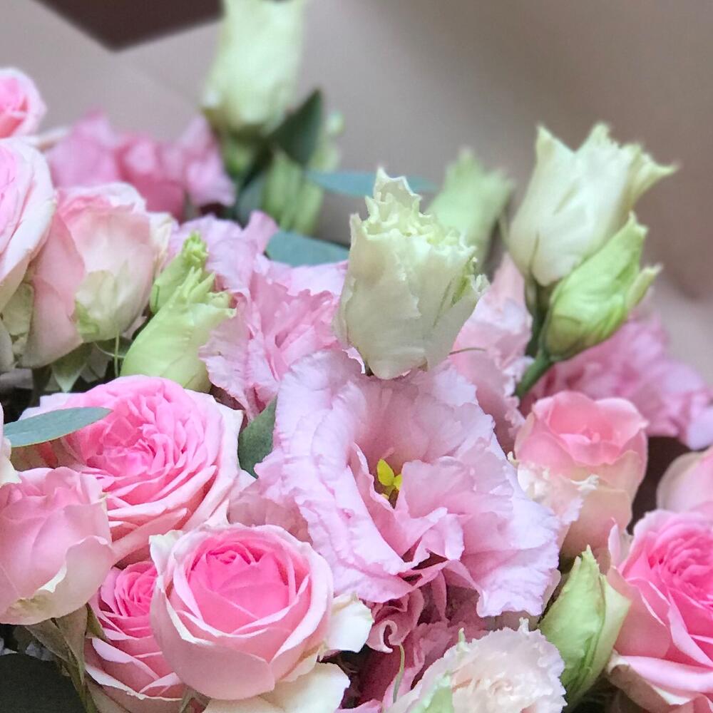 Пышный нежный и ароматный букет "Рассвет в любви" с розами, эвкалиптом, лизиантусом и генистой