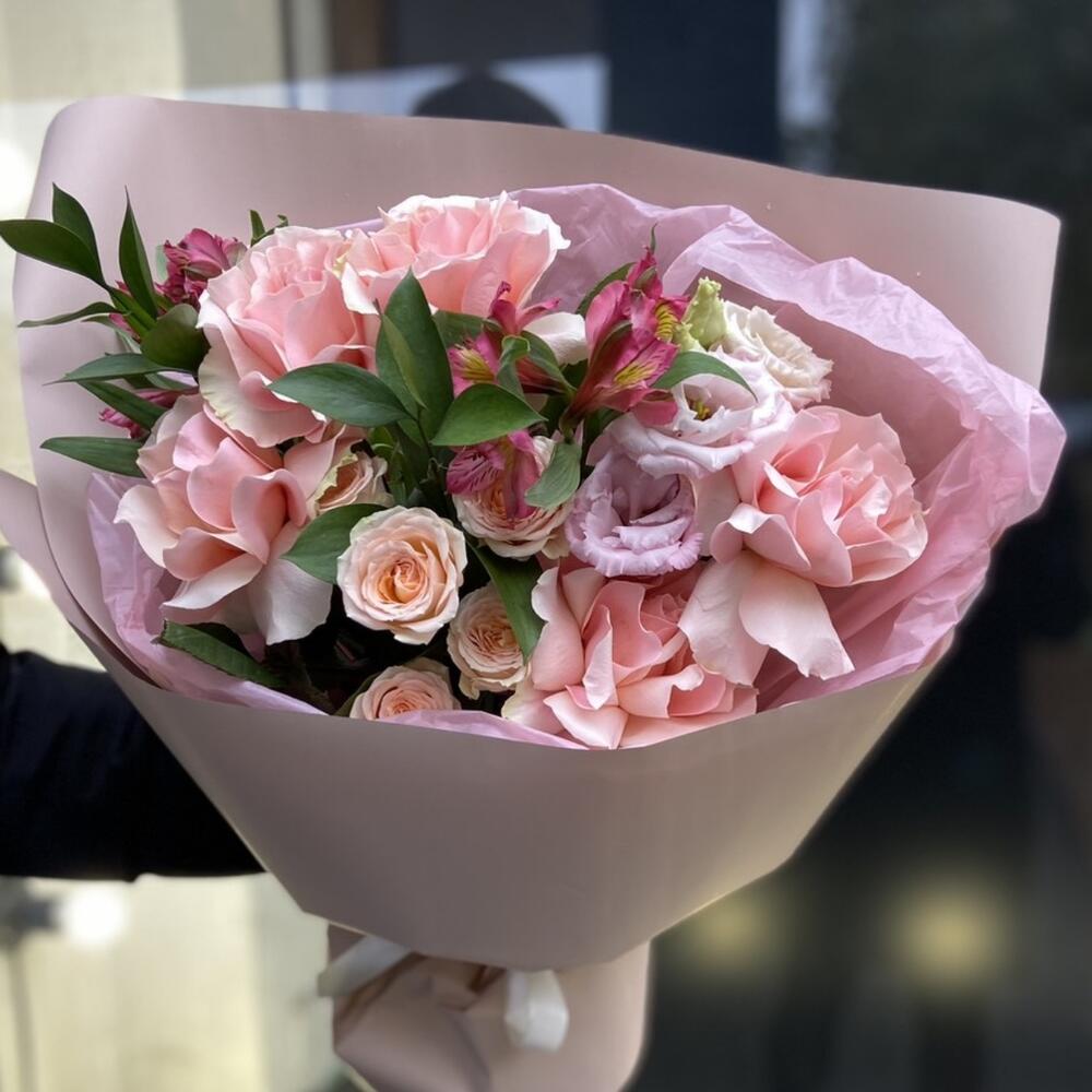 Альстромерия – 2 шт. Рускус – 2 шт. Кустовая роза – 1 шт. Эустома – 1 шт. Упаковка дизайнерская – 1 шт. французская роза пинк мондиаль – 5 шт.