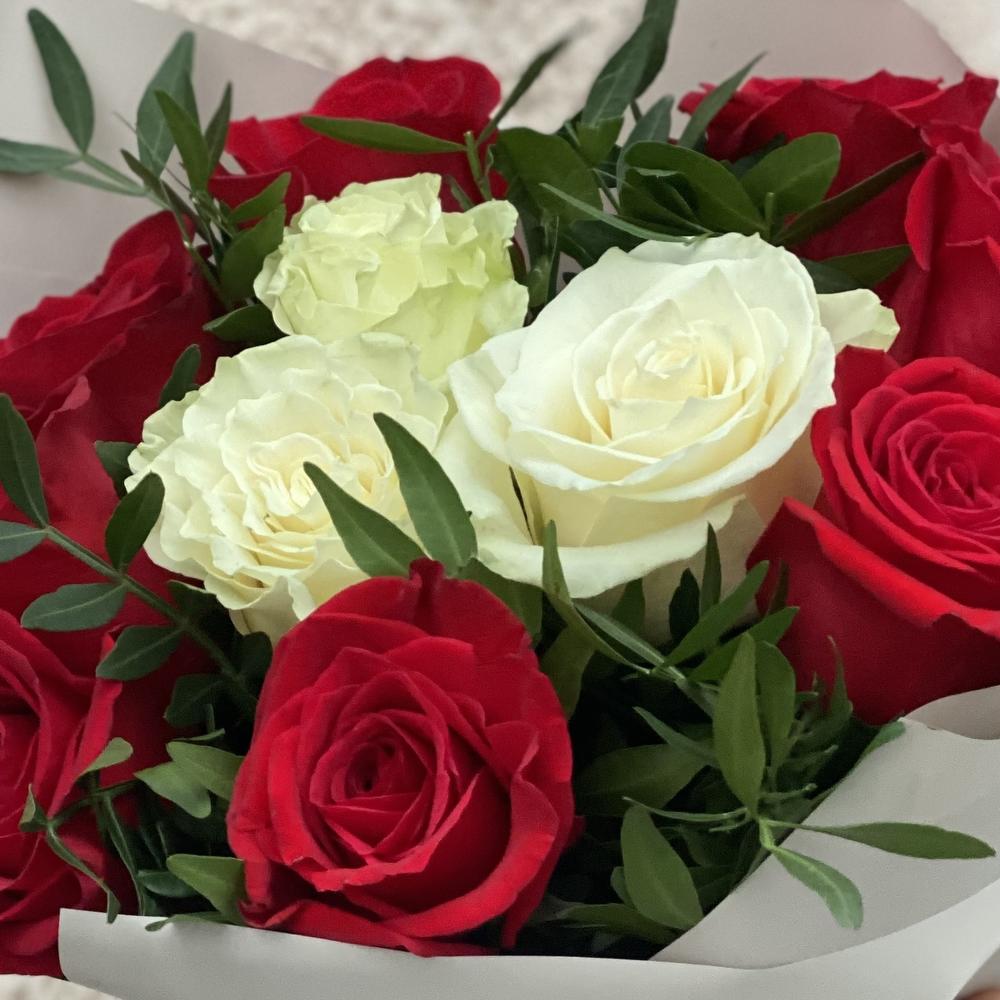 Роза белая – 3 шт. Роза красная – 8 шт. Оформление – 1 шт. Писташ – 5 шт.