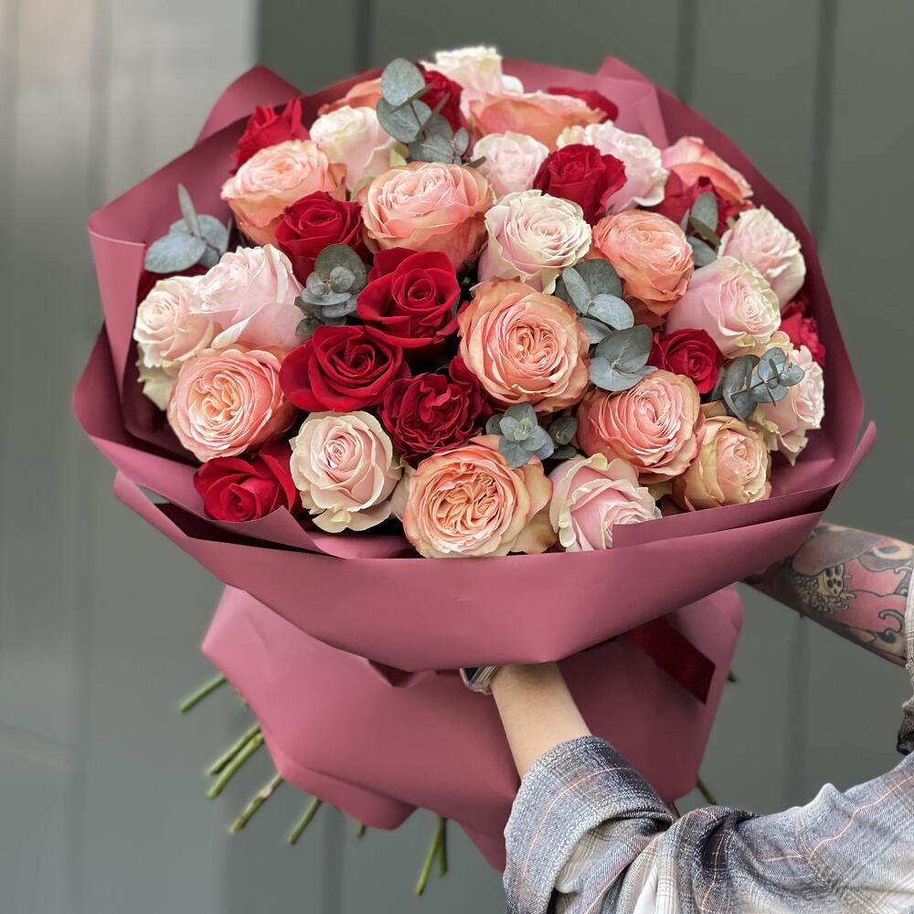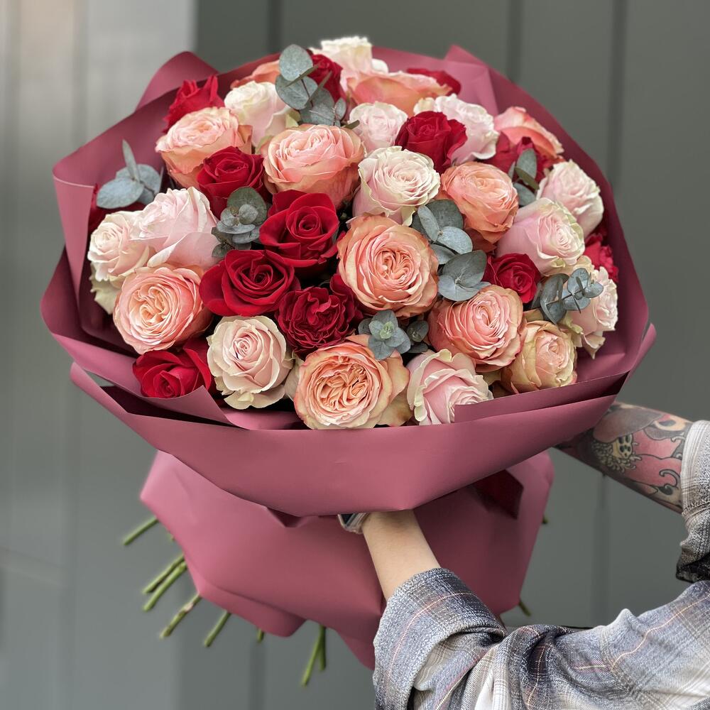 Букет из 3 видов роз и эвкалипта в оформлении!