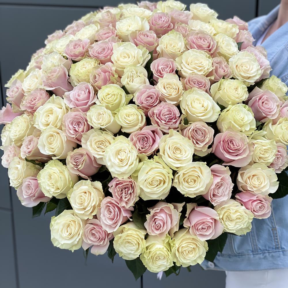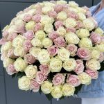 белая роза mondial – 51 шт. розовая роза pink mondial – 50 шт. Лента атласная – 1 шт.
