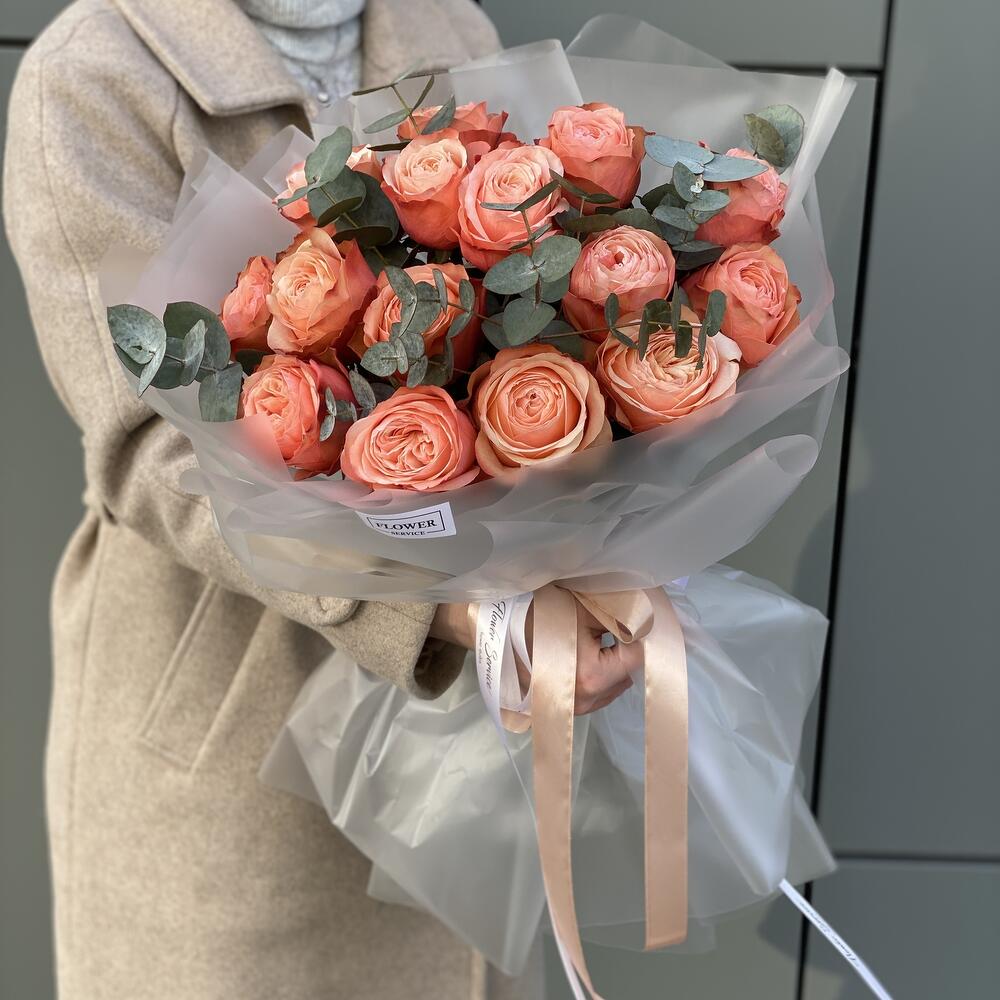 Эвкалипт – 2 шт. Оформление – 1 шт. роза сорта кахала – 15 шт.