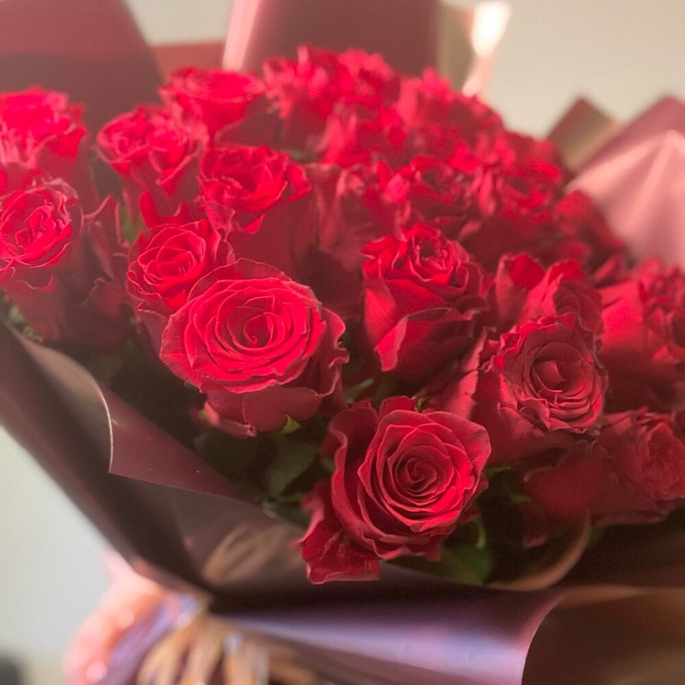 Лента атласная – 1 шт.Упаковка дизайнерская – 1 шт.роза кения – 31 шт.
