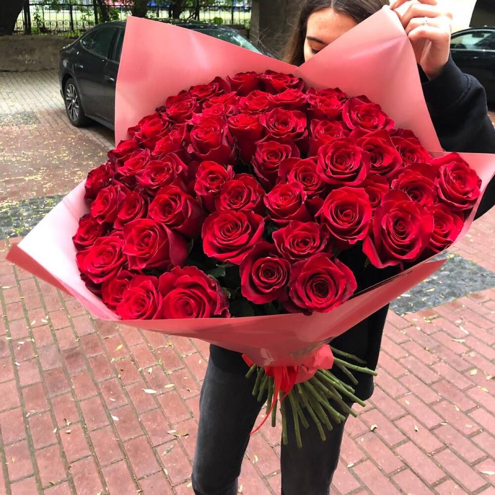 красная роза эквадор эксплорер 70 см – 51 шт.Корейская пленка – 2 шт.Атласная лента – 1 шт.