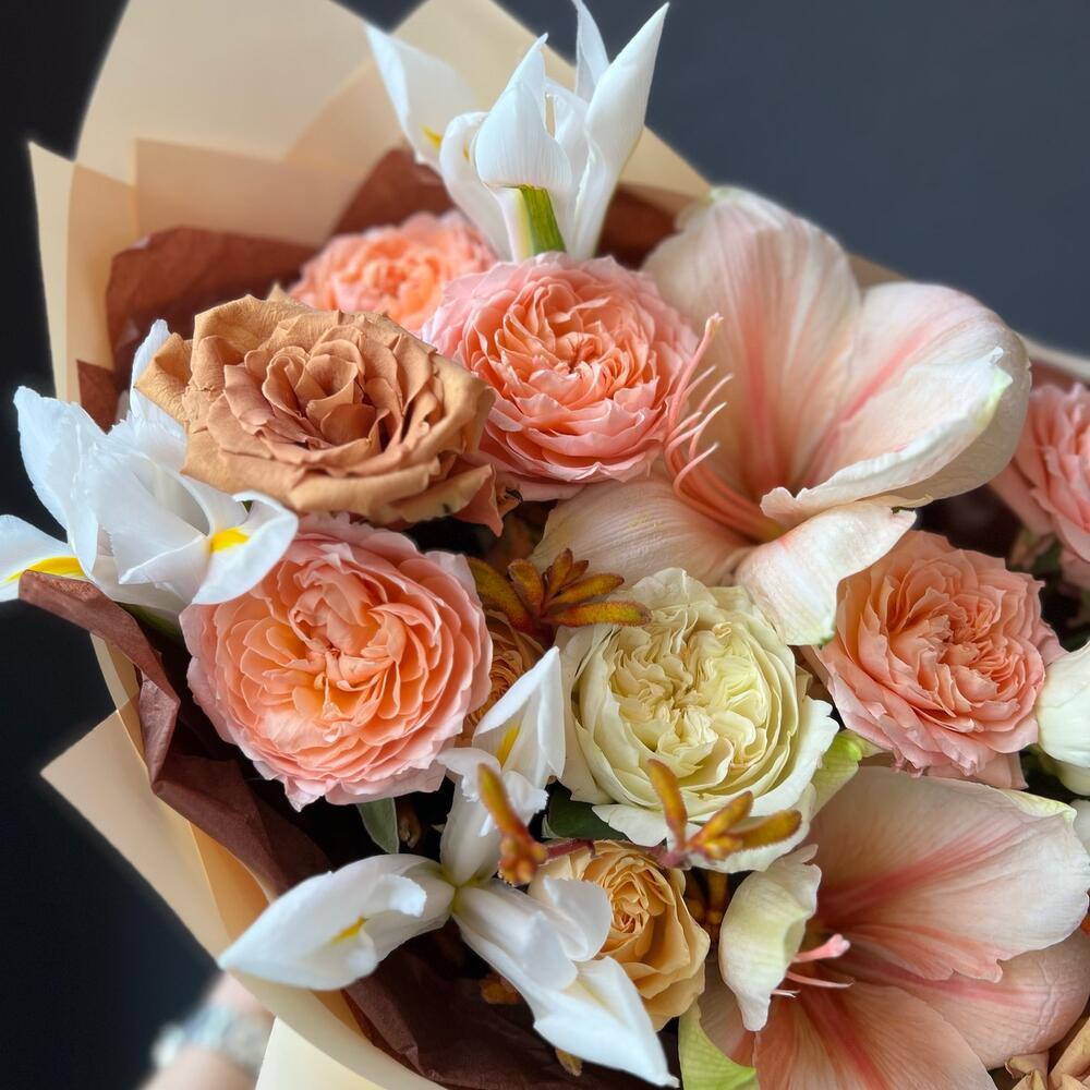 Амариллис – 1 шт.Кустовая роза – 4 шт.Пионовидная роза – 6 шт.Анигозантус – 3 шт.Ирис – 3 шт.Лизиантус – 2 шт.декоративная упаковка – 1 шт.Атласная лента – 1 шт.