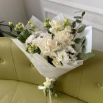 Букет из белых роз, хризантемы и эустомы