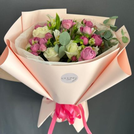 Альстромерии, Кустовые розы, Лизиантусы, Пионовидные розы, Розы, Ромашки