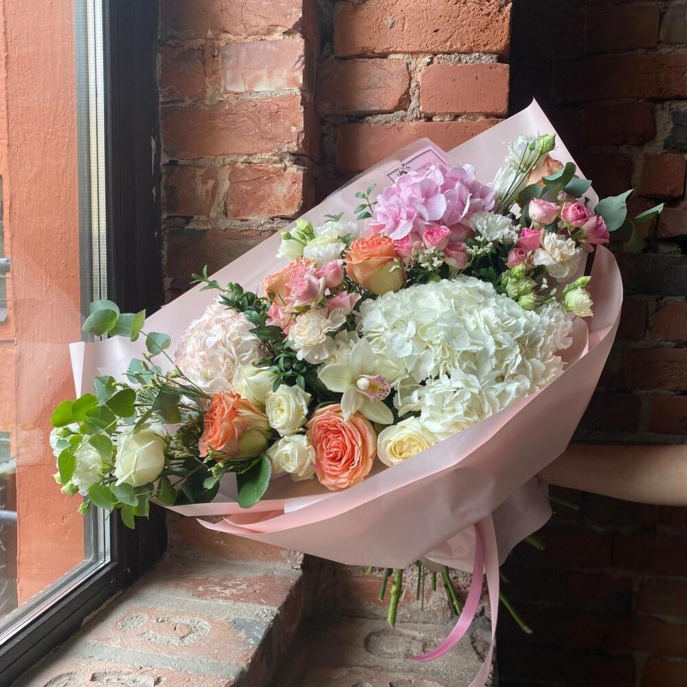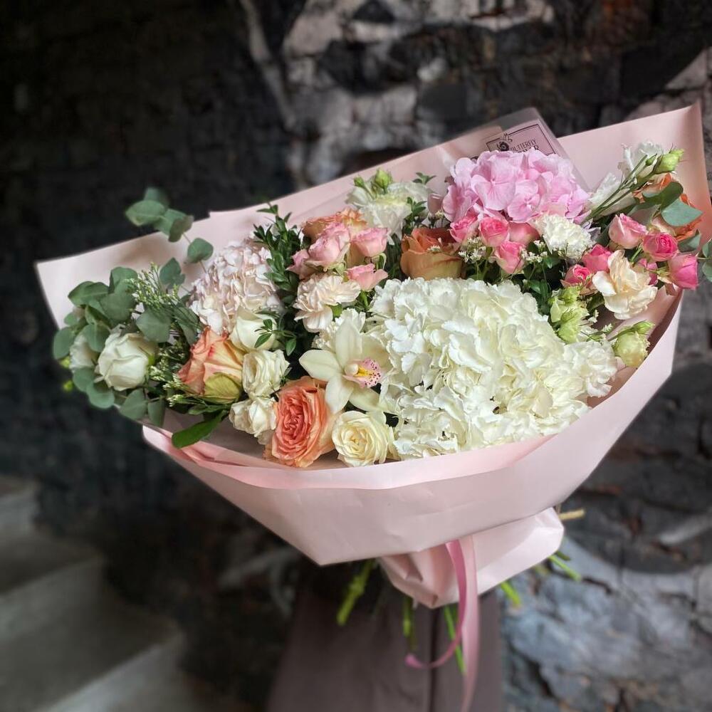 Букет из гортензий, диантусов, самшита, цимбидиума, роз, эустомы и лимониума в стильной упаковке “Сидней”