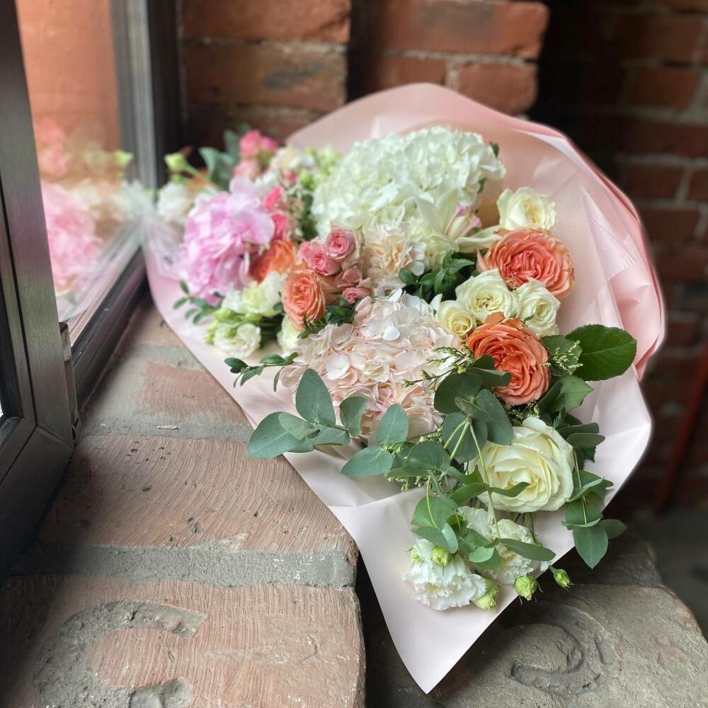 Букет из гортензий, пионов и пионовидных роз «Струны души»