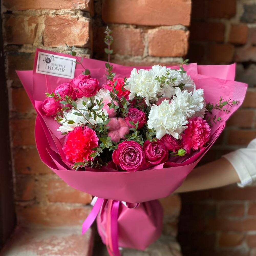 Категорий: Гвоздики, Кустовые розы, Пионовидные розы, Розы, Хризантемы