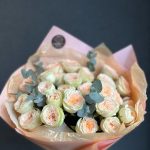 Кустовая роза – 7 шт.Эвкалипт – 5 шт.декоративная упаковка – 1 шт.Атласная лента – 1 шт.