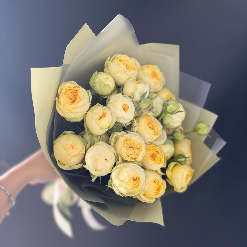 желтые пионовидные кустовые розы 60 см в дизайнерской упаковке – 7 шт. Дизайнерская упаковка – 1 шт. Открыточка с вашими пожеланиями – 1 шт. доставка – 1 шт.