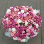 Пион Сара Бернар( Paeonia ‘Sarah Bernhardt’), Пион Салмон, Пион белый Мадам Клод Тэн (Mme Claude Tain), Кустовая пионовидная роза Силва Пинк (Silva Pink), Кустовая, пионовидная роза Misty Bubbles (Мисти Баблс), Роза кустовая Классик сенсешн (Classic Sensation), Стильная упаковка, Кустовая роза Корал Йо Йо, Лента атласная