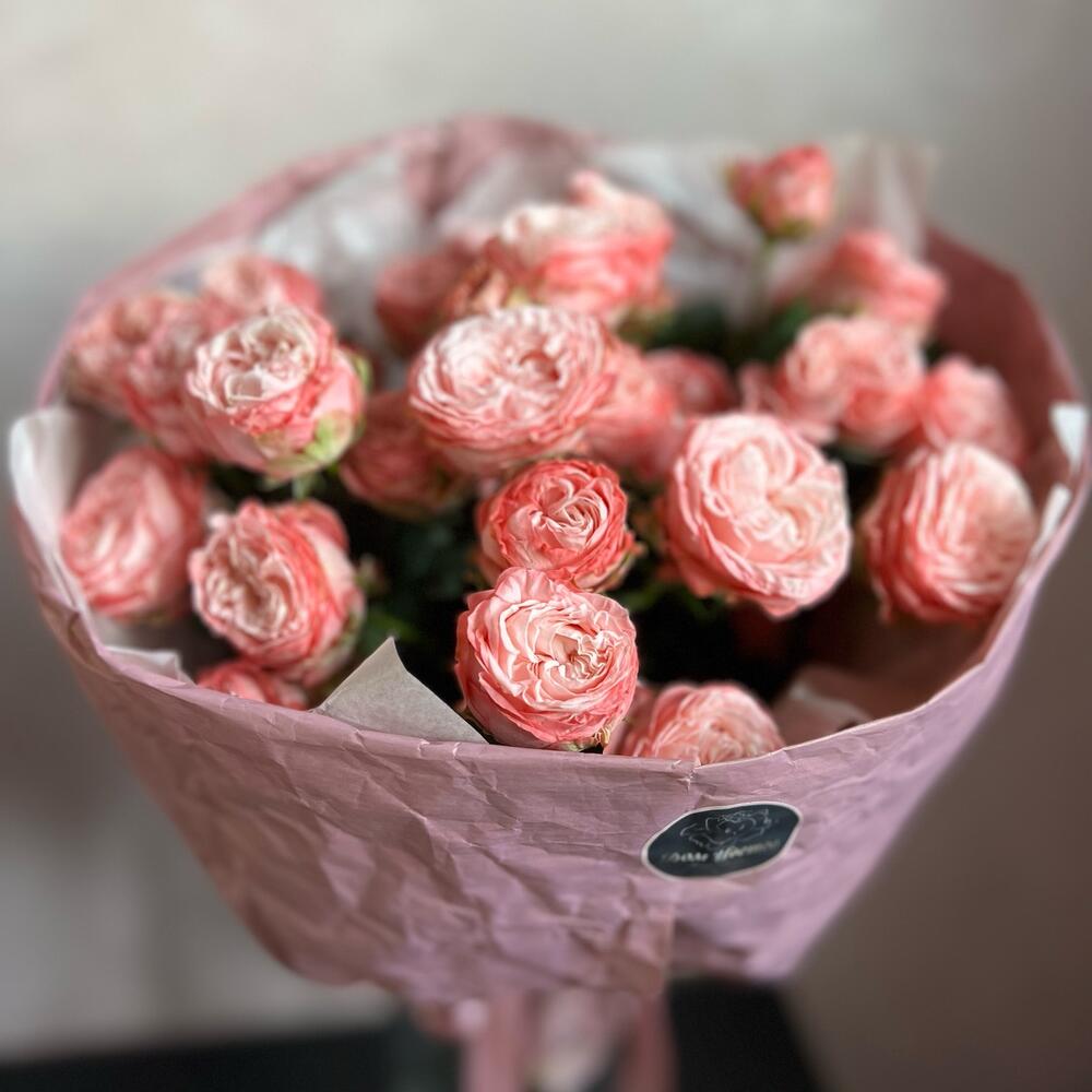 Кустовая пионовидная роза – 5 шт.декоративная упаковка – 1 шт.Атласная лента – 1 шт.