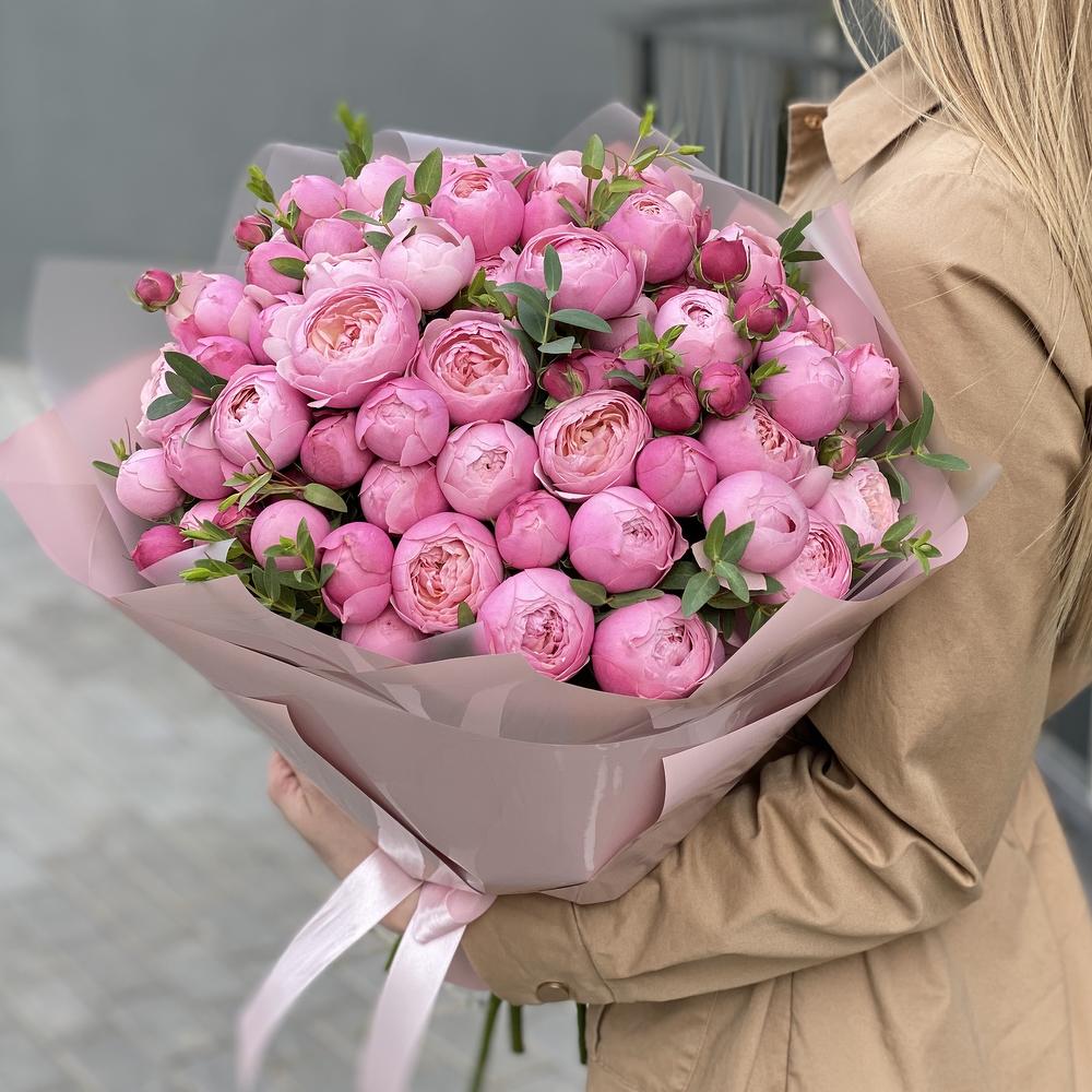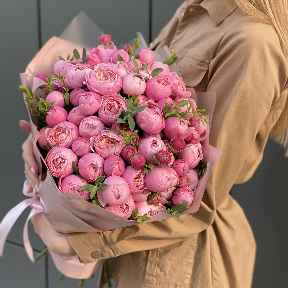 кустовая пионовидная роза сильвия пинк – 15 шт. Эвкалипт – 3 шт. Оформление – 1 шт.