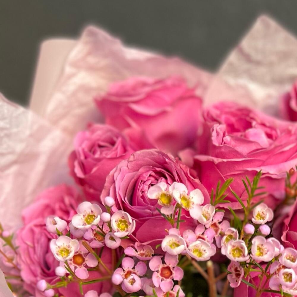 Кустовая пионовидная роза – 3 шт.Хамелациум – 1 шт.декоративная упаковка – 1 шт.Атласная лента – 1 шт.