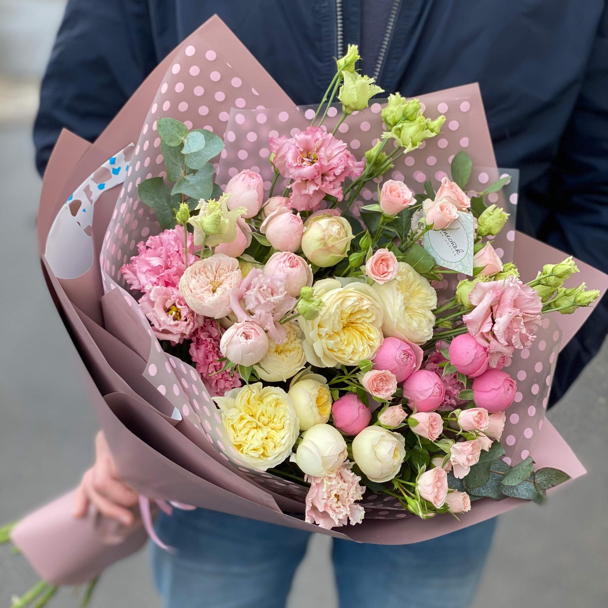 Розовый жемчуг Букет из французких роз и пион видных роз с хлопком