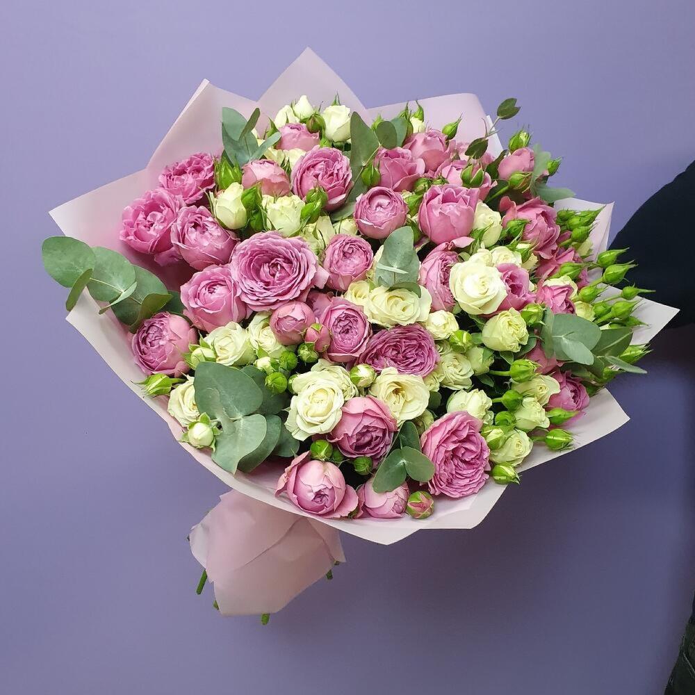 Роза пионовидная кустовая – 11 шт. Роза кустовая белая – 19 шт. Эвкалипт – 5 шт. Упаковка дизайнерская – 3 шт. Открыточка с вашими пожеланиями – 1 шт.