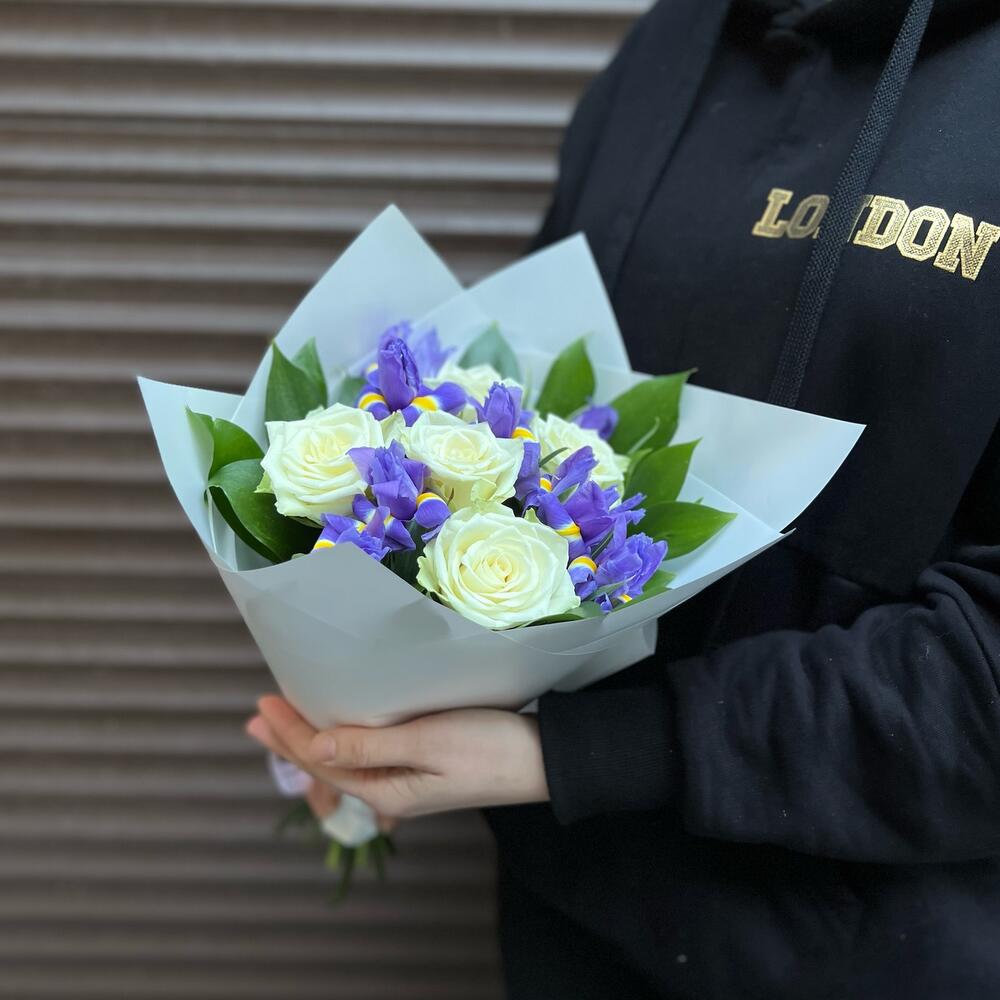 Ирис – 8 шт.Зелень – 8 шт.Роза белая – 5 шт.корея пленка – 1 шт.