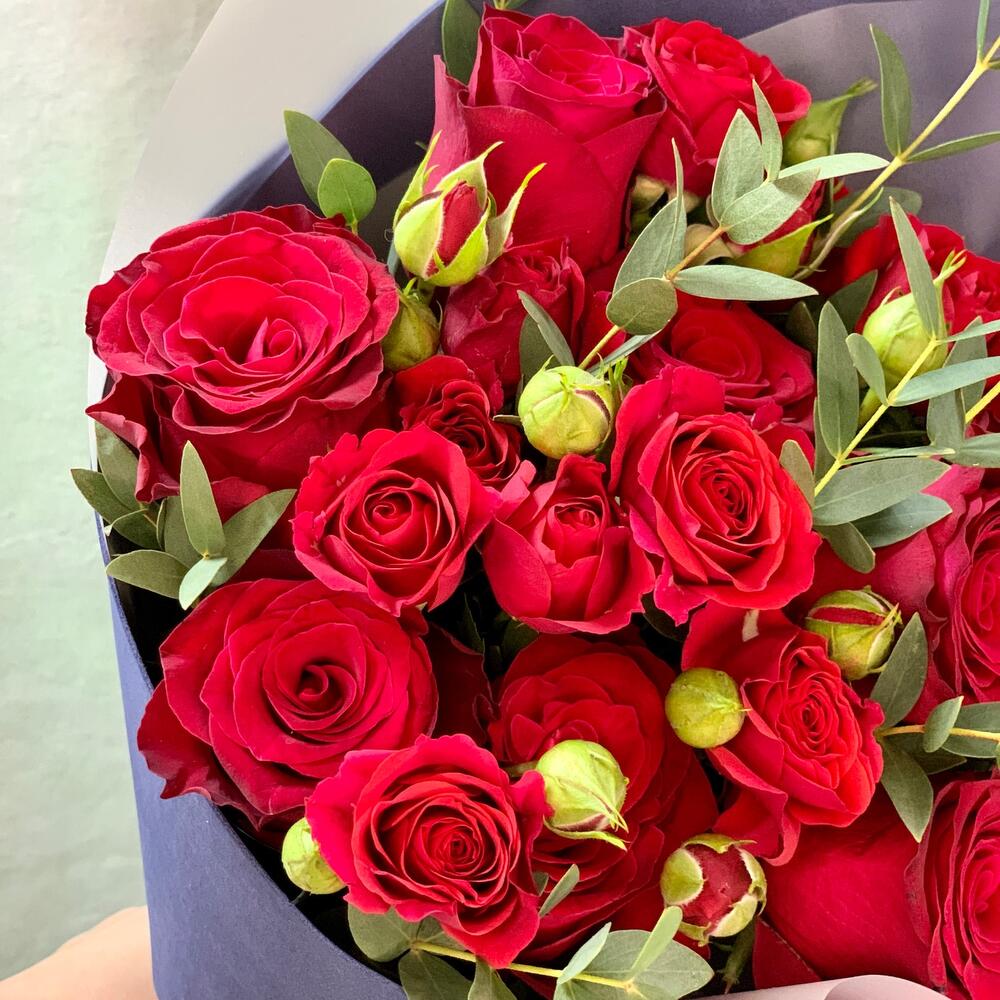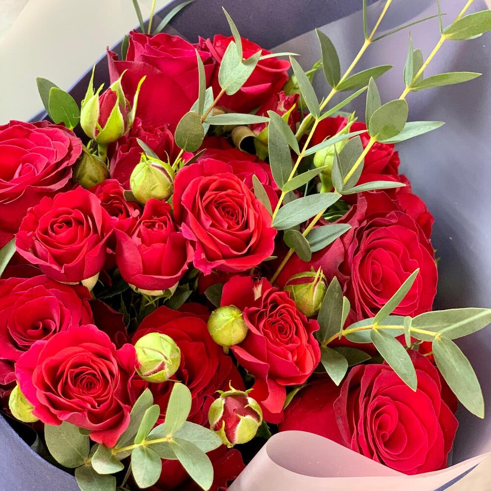 Роза кустовая – 2 шт.Рускус – 2 шт.Эвкалипт – 2 шт.Роза Кенийская – 7 шт.Упаковка дизайнерская – 2 шт.