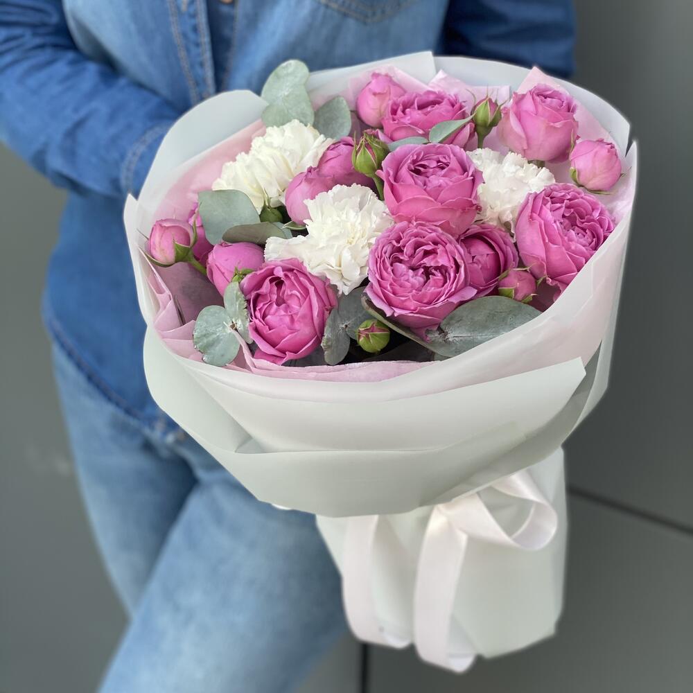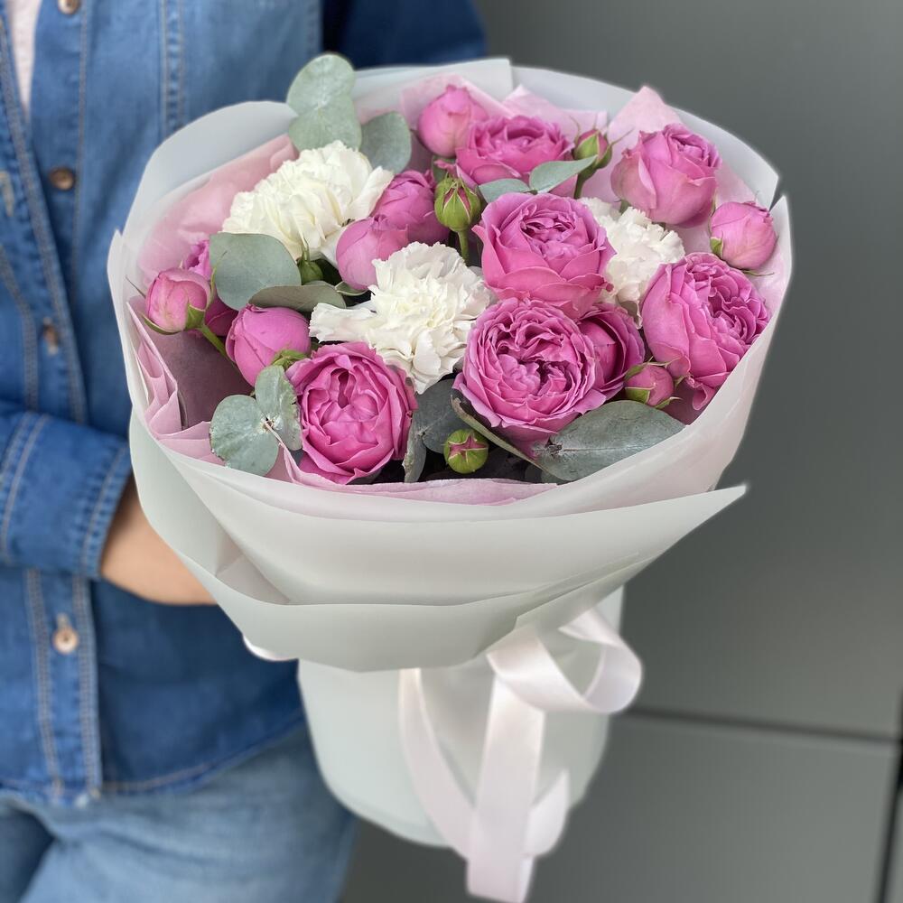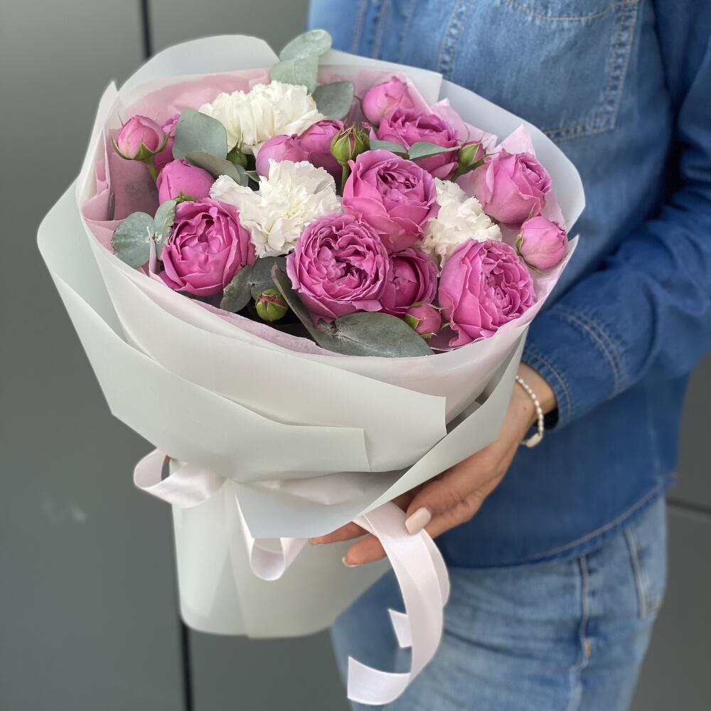 кустовая пионовидная роза misty bubbles – 4 шт. Гвоздика сортовая – 3 шт. Эвкалипт – 1 шт. Писташ – 2 шт. Оформление – 1 шт.