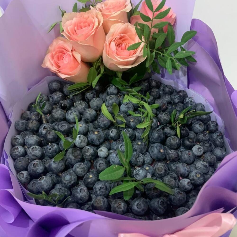 Голубика – 600 гр.Фисташка пучок – 1 шт.Дизайнерская упаковка – 1 шт.розы эквадор (60 см) – 5 шт.