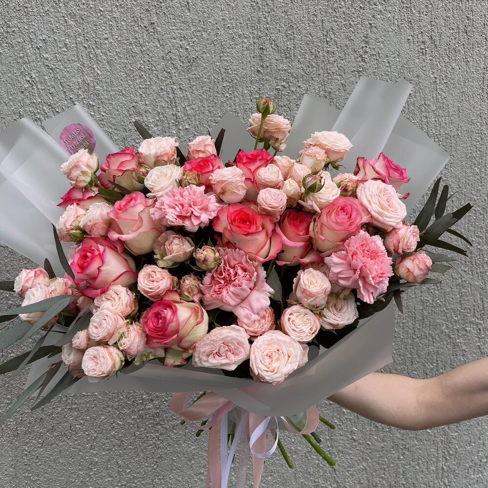Роза – 11 шт. Диантус – 4 шт. Роза кустовая – 5 шт. Эвкалипт – 2 шт. Упаковка – 1 шт. Атласная лента – 1 шт.