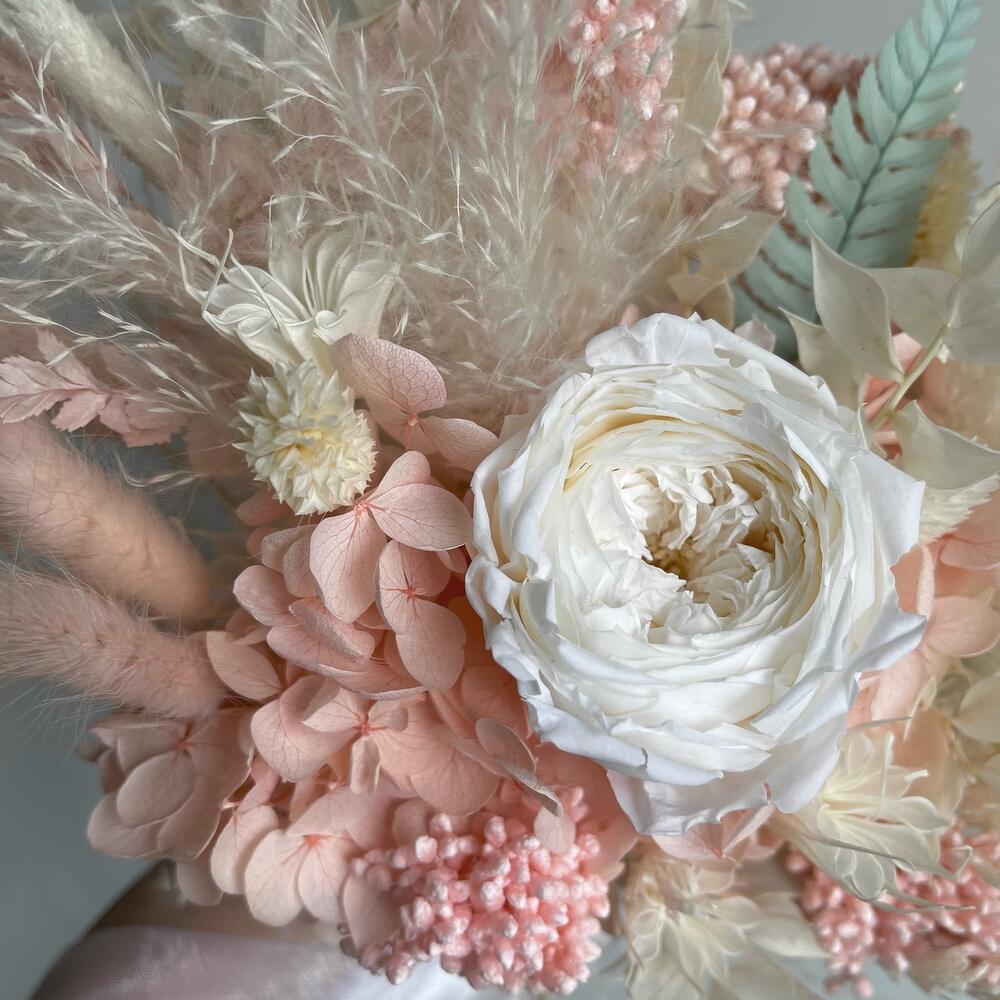 Лента органза – 1 шт.Лента шелк – 1 шт.Роза стабилизированная – 1 шт.гортензия стабилизированная – 1 шт.Лагурус – 14 шт.Нигелла – 1 шт.Озотамнус – 1 шт.пампасная трава – 1 шт.папоротник стабилизированный – 4 шт.Фаларис – 10 шт.Ковыль – 2 шт.Рускус – 3 шт.