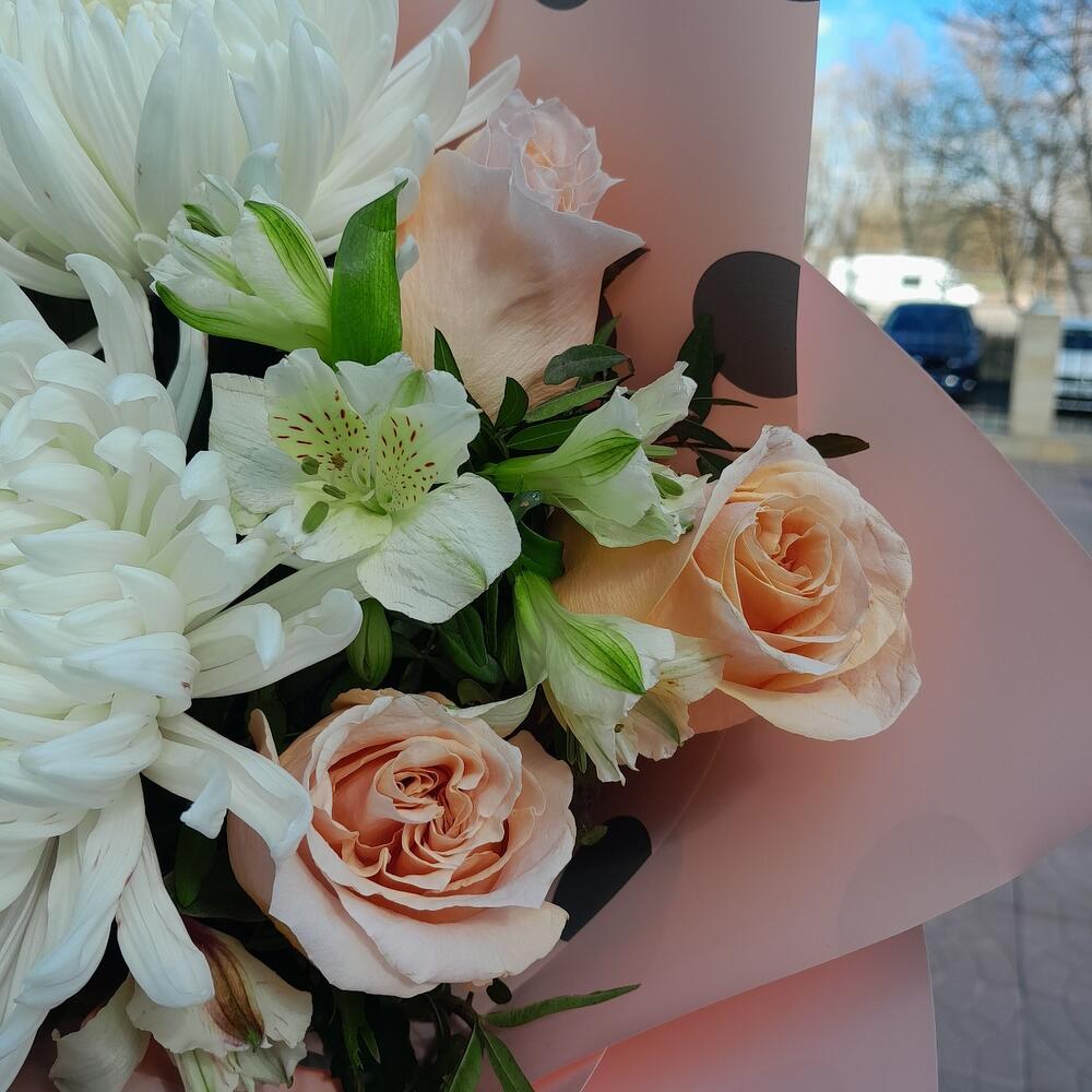 Альстромерия – 3 шт.Хризантема кустовая – 1 шт.Роза – 3 шт.Хризантема – 2 шт.Лента атласная – 2 шт.Фисташка – 2 шт.Упаковка дизайнерская – 2 шт.