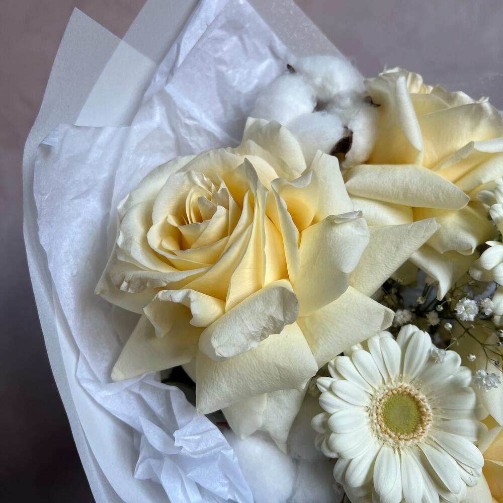 Одноголовая роза – 3 шт.Гербера – 3 шт.Гипсофила – 1 шт.Сухоцвет – 2 шт.декоративная упаковка – 1 шт.Атласная лента – 1 шт.