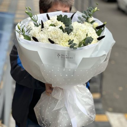 Грациозный букет из белоснежных роз, ароматных веток малины и амаранта.