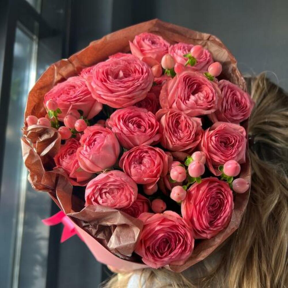 Роза кустовая пионовидная – 5 шт.Гиперикум – 3 шт.декоративная упаковка – 1 шт.Атласная лента – 1 шт.
