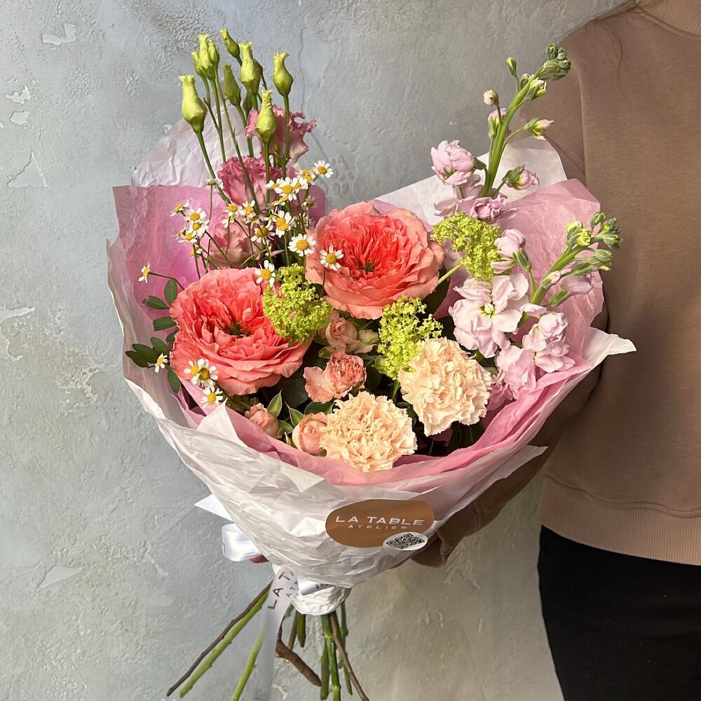 Роза пионовидная – 2 шт.Диантус – 2 шт.Роза кустовая пионовидная – 1 шт.Лизиантус – 1 шт.Маттиола – 2 шт.Матрикария – 1 шт.Упаковка дизайнерская – 1 шт.