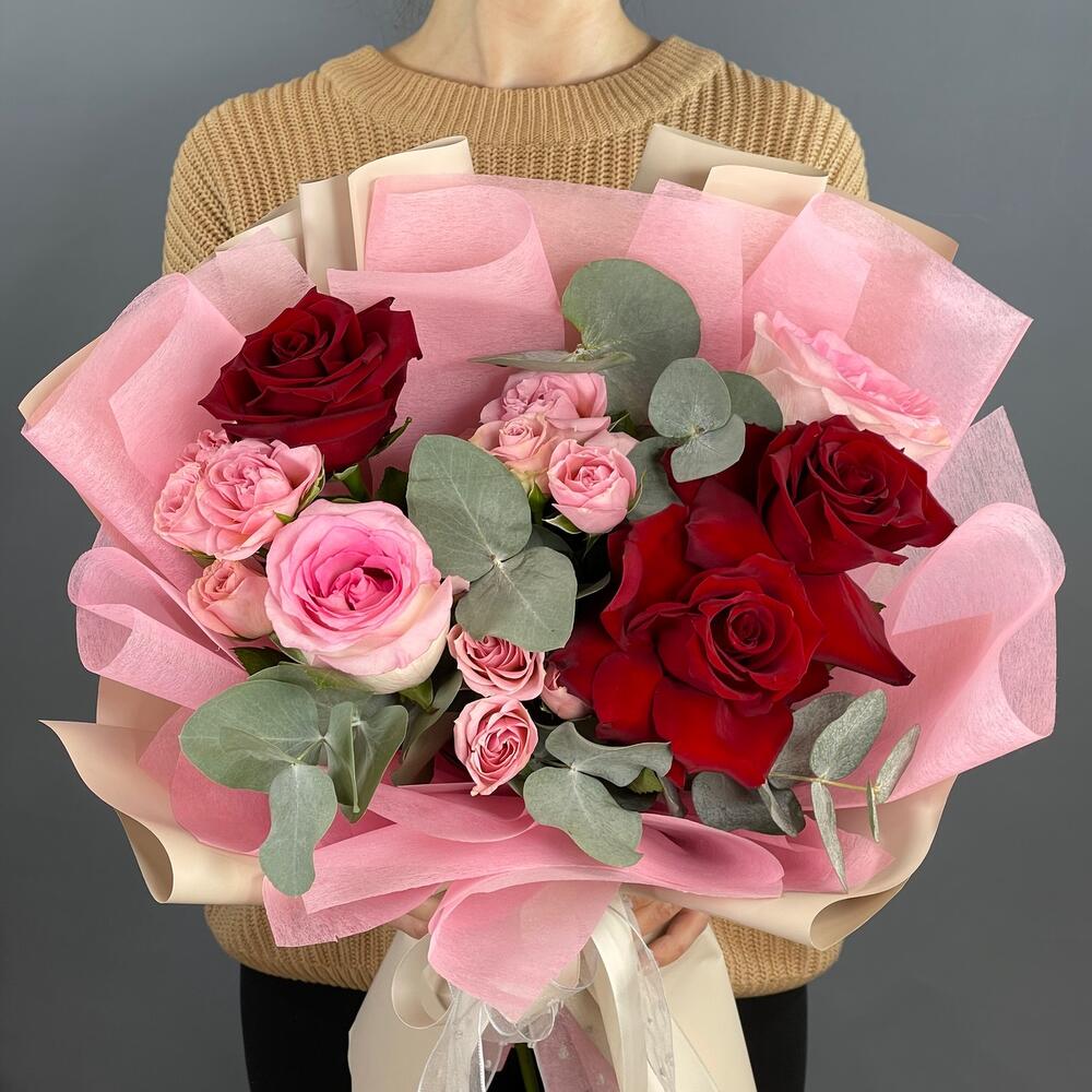 Роза одноголовая – 5 шт.Роза кустовая – 3 шт.Эвкалипт – 2 шт.Упаковка дизайнерская – 2 шт.Лента – 2 шт.