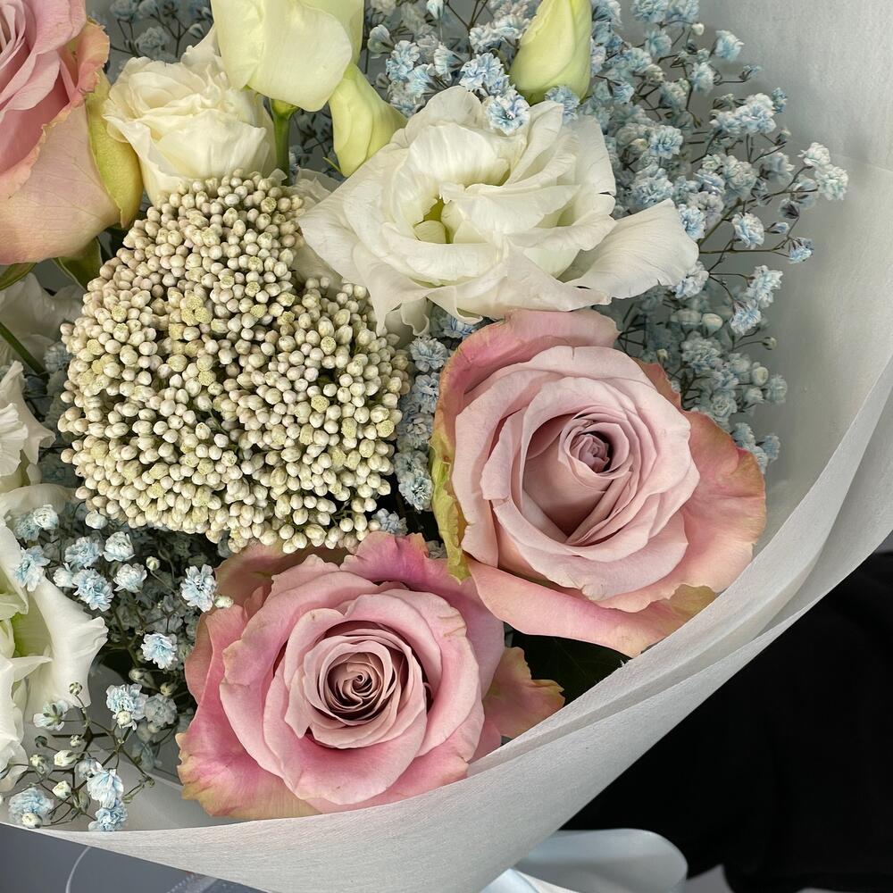Гипсофила – 1 шт.Лента – 2 шт.Лизиантус – 2 шт.Озотамнус – 1 шт.Роза – 3 шт.Упаковка – 1 шт.
