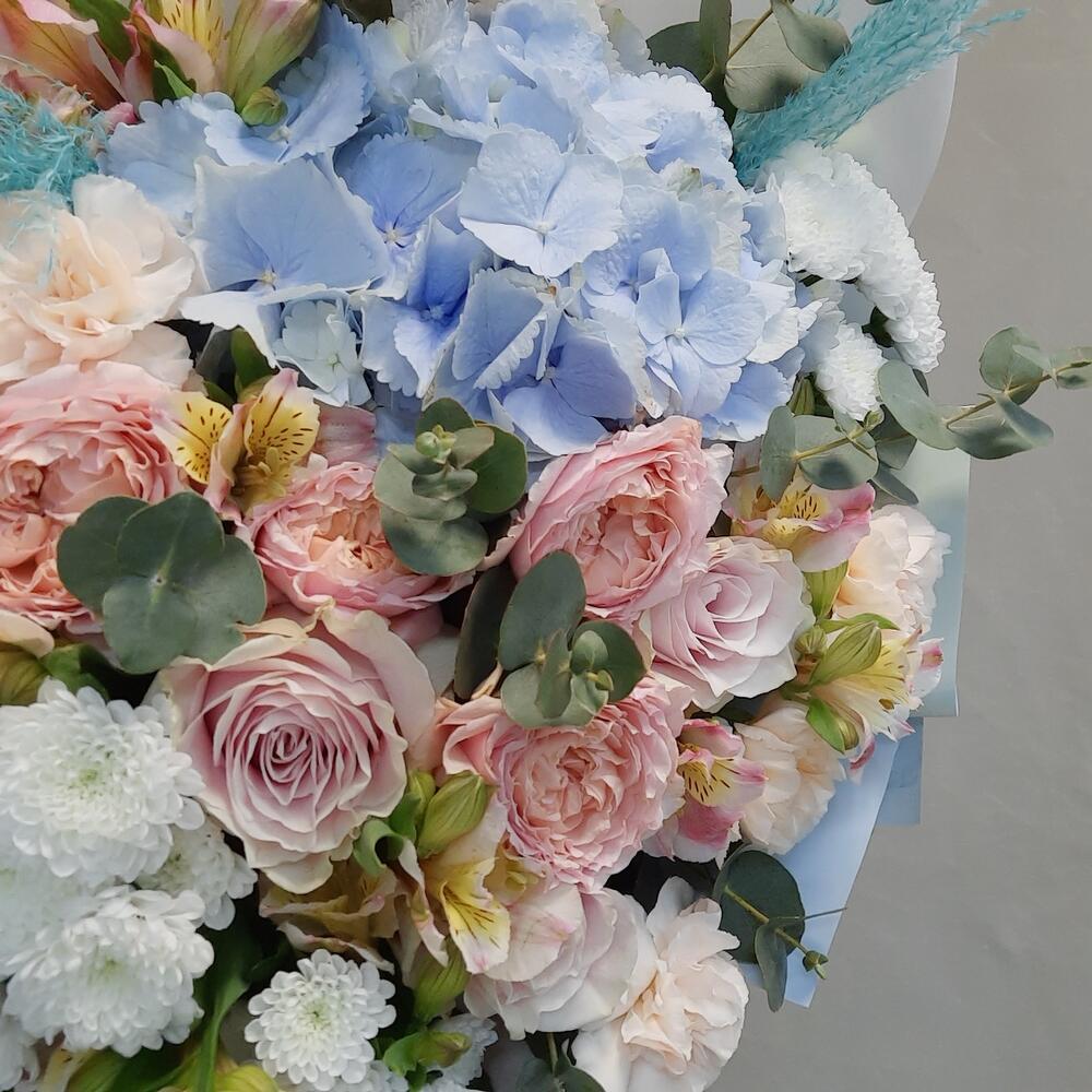 Букет с голубой гортензией и пион розой