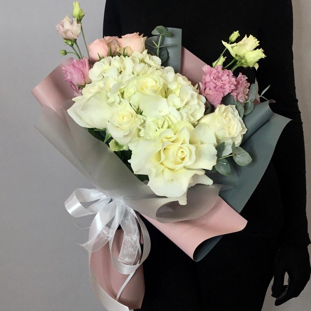 Букет с гортензией, розой Мондиаль и эустомой “Нежные нотки”