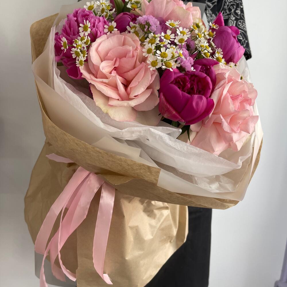 Пион – 6 шт.Статица – 1 шт.Ромашка – 3 шт.Тишью – 2 шт.Крафт – 4 шт.Роза французская – 3 шт.