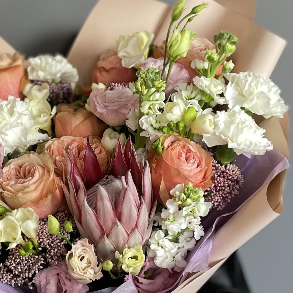Маттиола – 3 шт.Озотамнус – 5 шт.Протея – 1 шт.Фрезия – 10 шт.Роза – 7 шт.Гвоздика – 11 шт.Эустома – 2 шт.Фисташка – 4 шт.